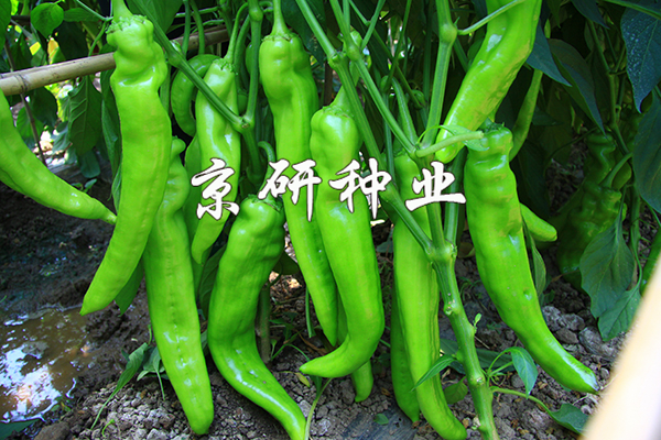 中早熟、豐產辣椒F1,無限生長型;耐低溫,低溫寡照下座果優(yōu)秀,持續(xù)座果能力強;膨果速度快;果實特長牛角形,果基有皺,果型順直。果型為26-28×5.5厘米,單果重100-150克;果皮黃綠色,耐貯運;較耐熱耐濕,抗病毒病和青枯病。適于華北、西北及東北地區(qū)保護地種植。