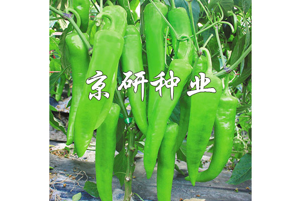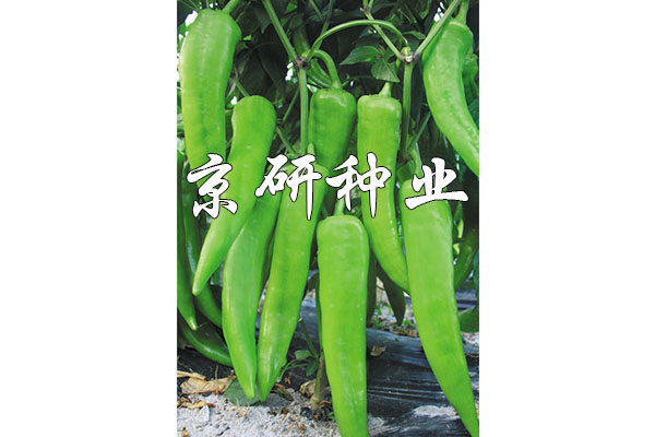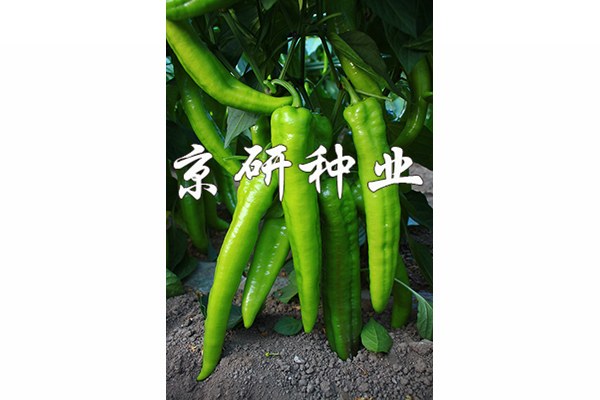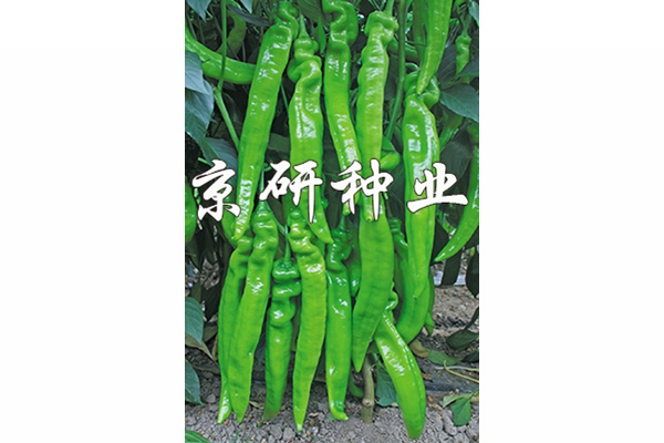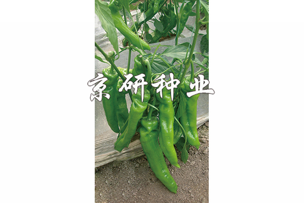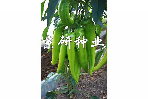 中早熟辣椒F1雜交種,植株開展度中等,生長旺盛。連續(xù)座果性強,耐寒性好,果實長牛角形,果型順直,果面光滑。商品果淡綠色,成熟后轉紅色。在正常溫度下,長度可達24-30cm,直徑4.8cm左右,外表光亮,商品性好。單果重100-150g,辣味中。抗病毒病能力強。適合秋冬茬、早春茬保護地以及日光溫室一大茬種植。